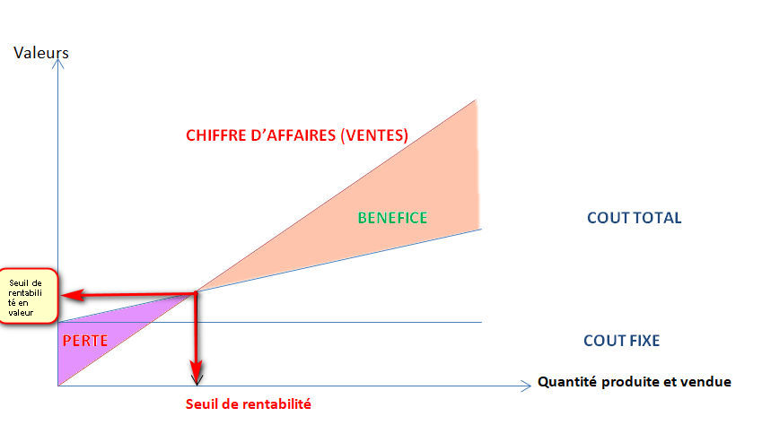 Le seuil de rentabilité nous indique quelle est la quantité minimale à vendre pour couvrir la totalité des charges avec le chiffre d’affaires. C’est le chiffre d’affaires pour lequel on ne gagne ni ne perd rien. Dès que l’on produit et vend d’avantage on gagne de l’argent. De plus en plus. Jusqu’à atteindre la capacité maximale de l’appareil productif qui est évidemment une limite. Le coût total est la somme du coût fixe et du coût variable total: CF + vq (où v est le coût variable unitaire et q la quantité produite et vendue). Le chiffre d’affaires est le produit de la quantité vendue q par le prix de vente, soit qp.